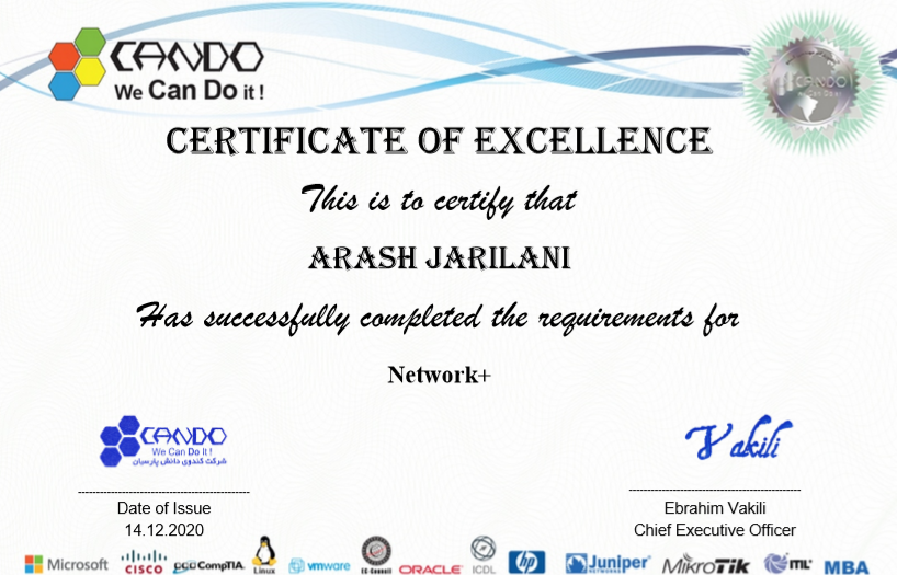 Network+ Certificate issued by Cando educational institution, Tehran,